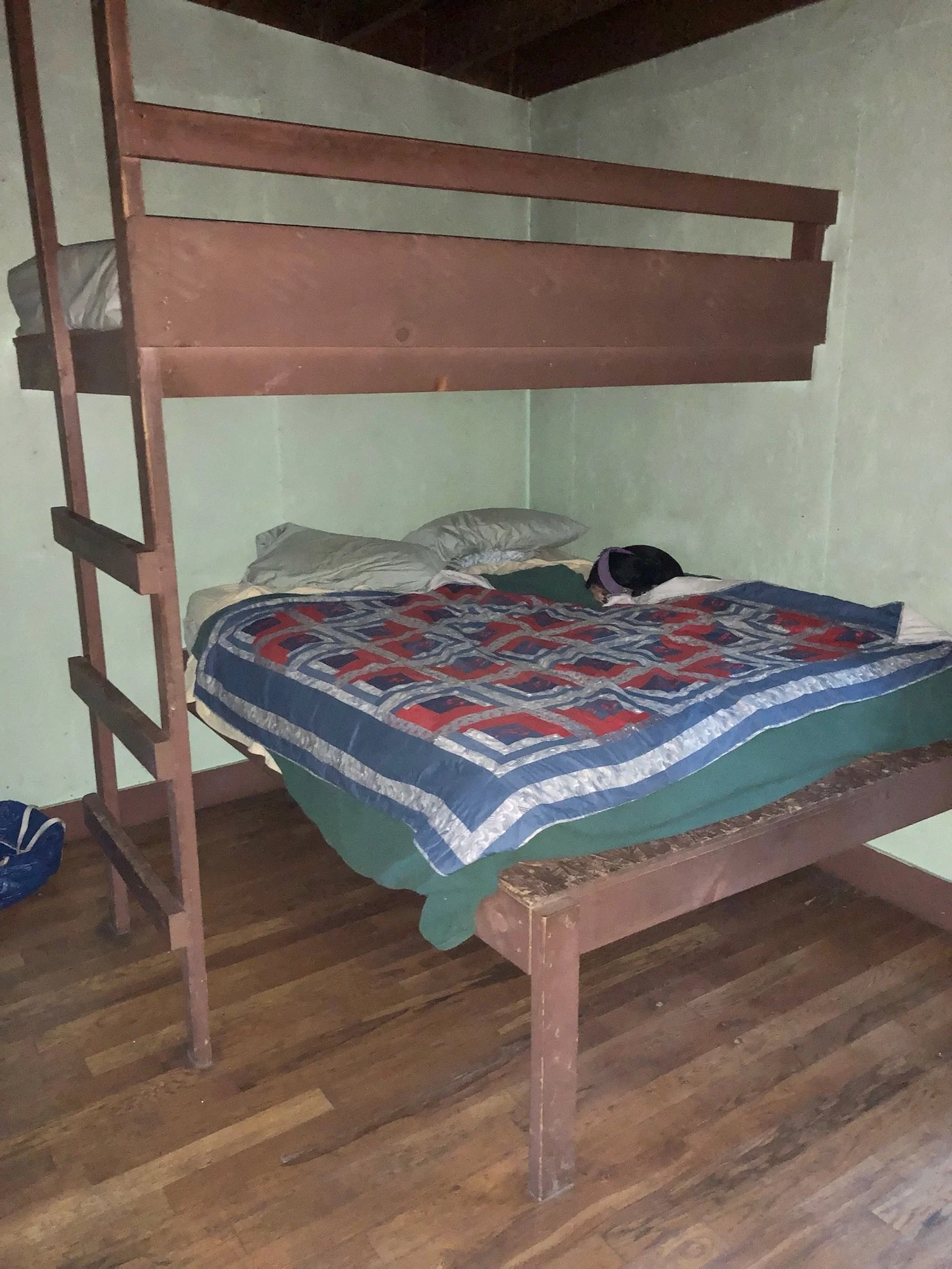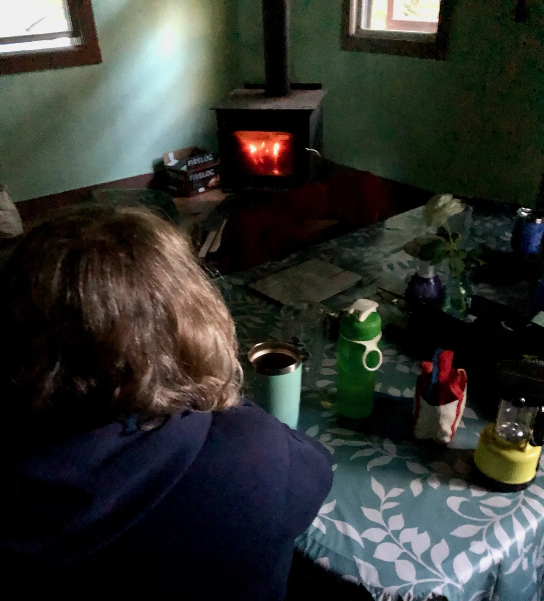 At night it was just spooky. The trees blocked out all the light. We could not see the sky or stars. It was darker than I can ever remember. There were port-a-potties a couple hundred feet away from the cabin. In the dark, you could hear animals rustling. We made campfires and grilled on the barbecue and started fires in the woodturning stove. There was a lot of fire.